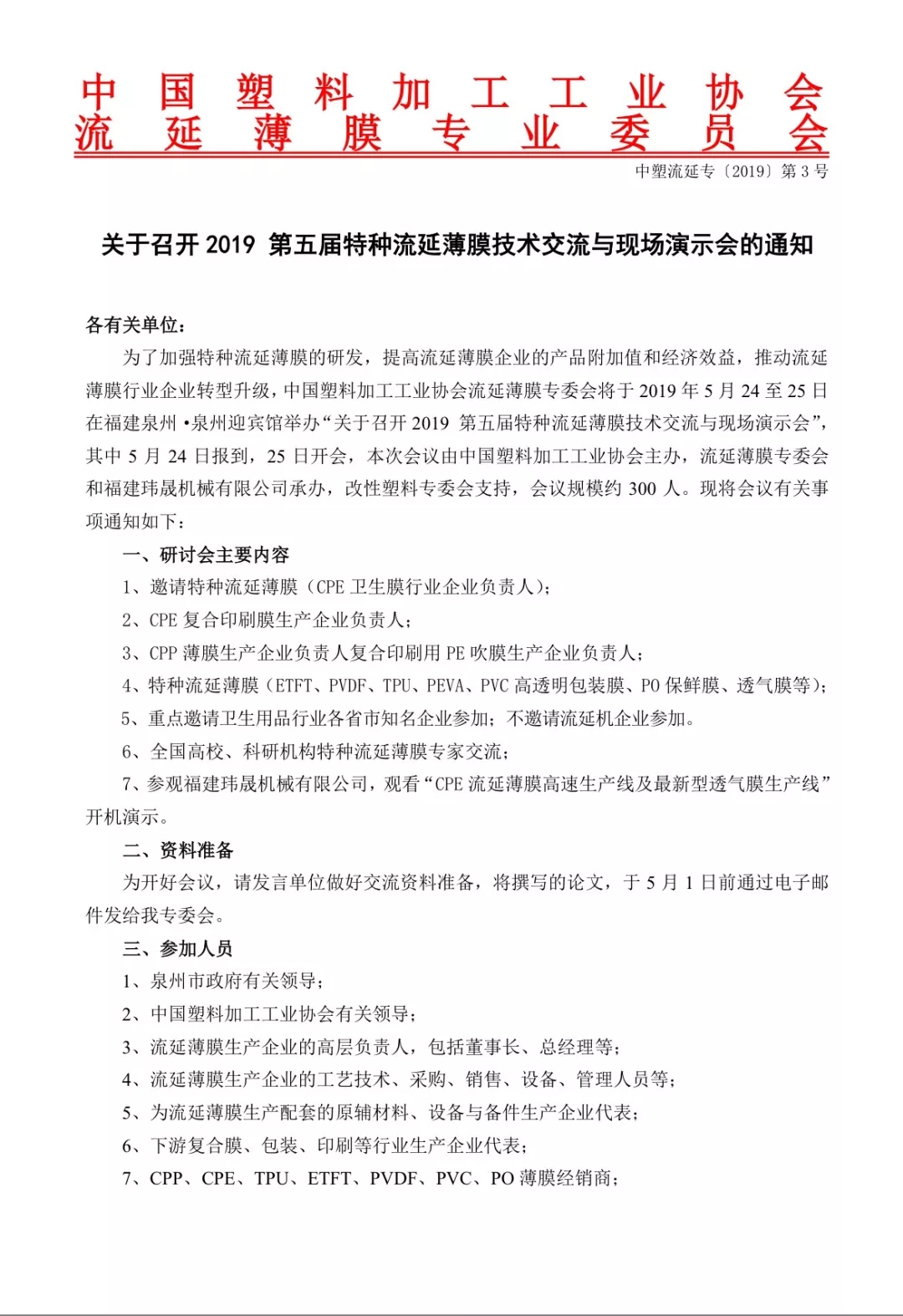關(guān)于召開2019 第五屆特種流延薄膜技術(shù)交流與現(xiàn)場演示會(huì)的通知